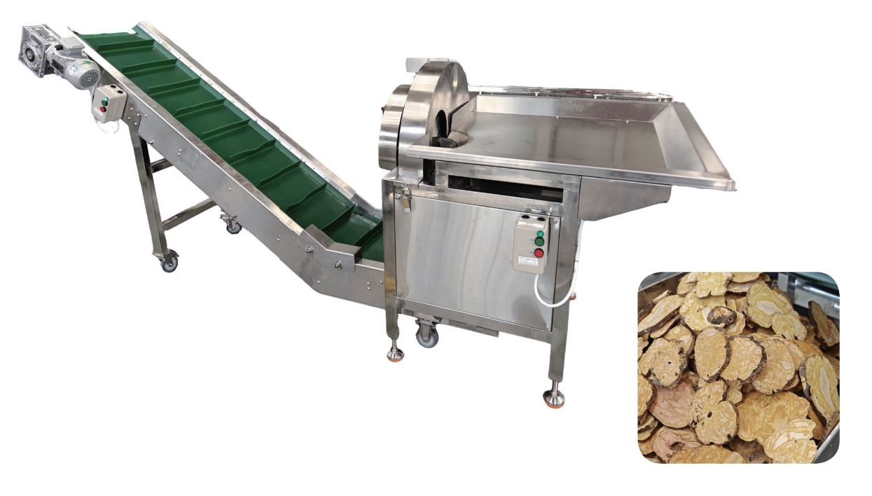 Lát Cắt Nghiêng Đặc Trưng: Nhờ thiết kế phễu nạp liệu nghiêng độc đáo, máy tạo ra các lát cắt có diện tích bề mặt lớn hơn so với cắt thẳng truyền thống. Điều này cho ra đời các dạng lát dày nghiêng hoặc lát mỏng lớn, đáp ứng xuất sắc yêu cầu về hình thái và chất lượng trong bào chế thuốc Đông dược.