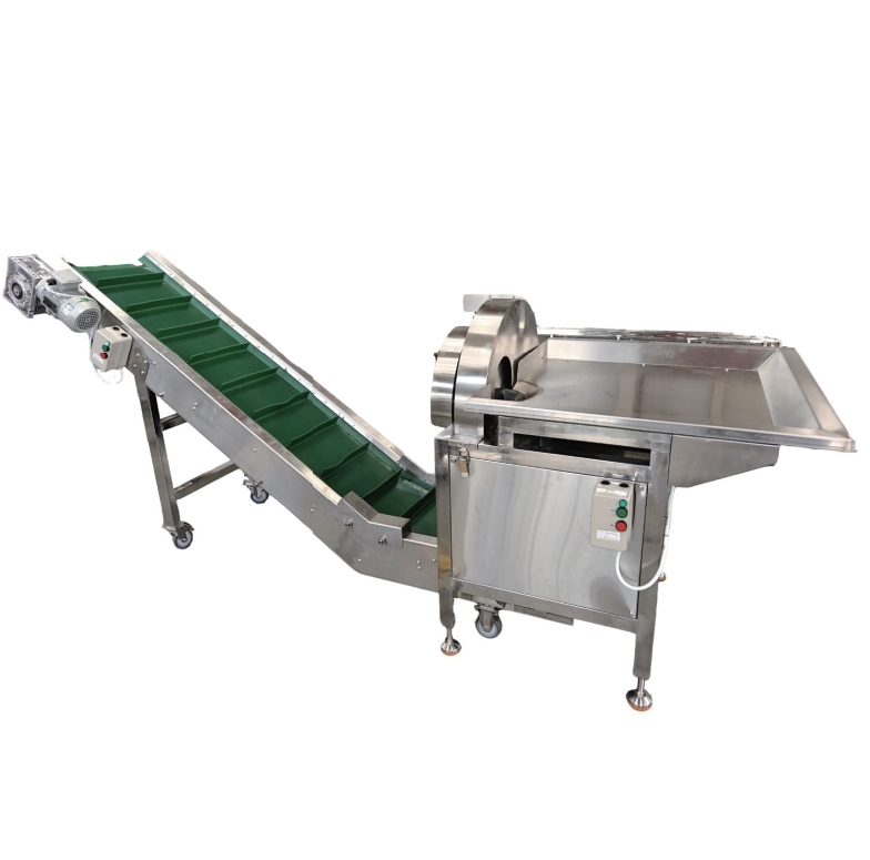 Tự Động Hóa, Tiết Kiệm Nhân Công: Máy được tích hợp băng chuyền tự động tại cửa ra, giúp vận chuyển nguyên liệu đã cắt ra ngoài một cách nhanh chóng, thuận tiện cho khâu chế biến tiếp theo, nâng cao hiệu suất tổng thể.